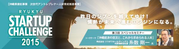 琉球大学産学官連携推進機構(産学官連携推進機構長:屋 宏典)と沖縄発のインターネットベンチャーである琉球インタラクティブ株式会社(本社:沖縄県宜野湾市、代表取締役社長:臼井 隆秀、以下「琉球インタラクティブ」)は、Ryukyu Startup Challenge 2015「第3回スペシャルセミナー」を2015年12月19日(土)に開催します。