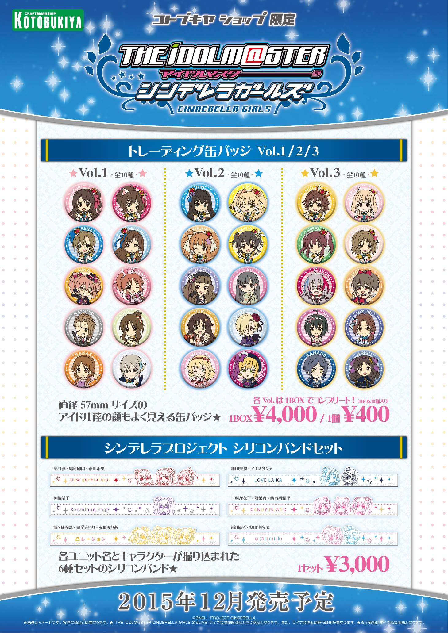 ホビーメーカー株式会社壽屋(本社:東京都立川市曙町/代表:清水一行)は、2015年11月28日・29日の2日間、幕張メッセ国際展示場で行われたライブイベント「THE IDOLM@STER CINDERELLA GIRLS 3rdLIVE シンデレラの舞踏会 - Power of Smile -」会場で販売した限定グッズ4種を、2015年12月よりコトブキヤショップ限定で販売開始します。