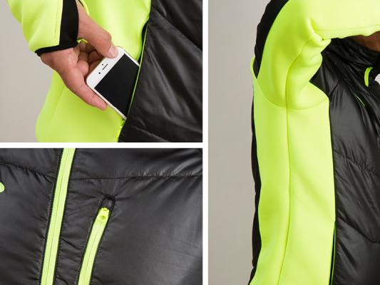 脇・袖下部部の切替に柔らかく伸縮性のある生地を採用し、可動性を高めました。ポケットはファスナー付きなので、激しい運動をしても、ポケットの中身が落ちません。左胸にもファスナーポケットがあり、iPhoneを入れて、音楽を聞きながらランニングもできます。