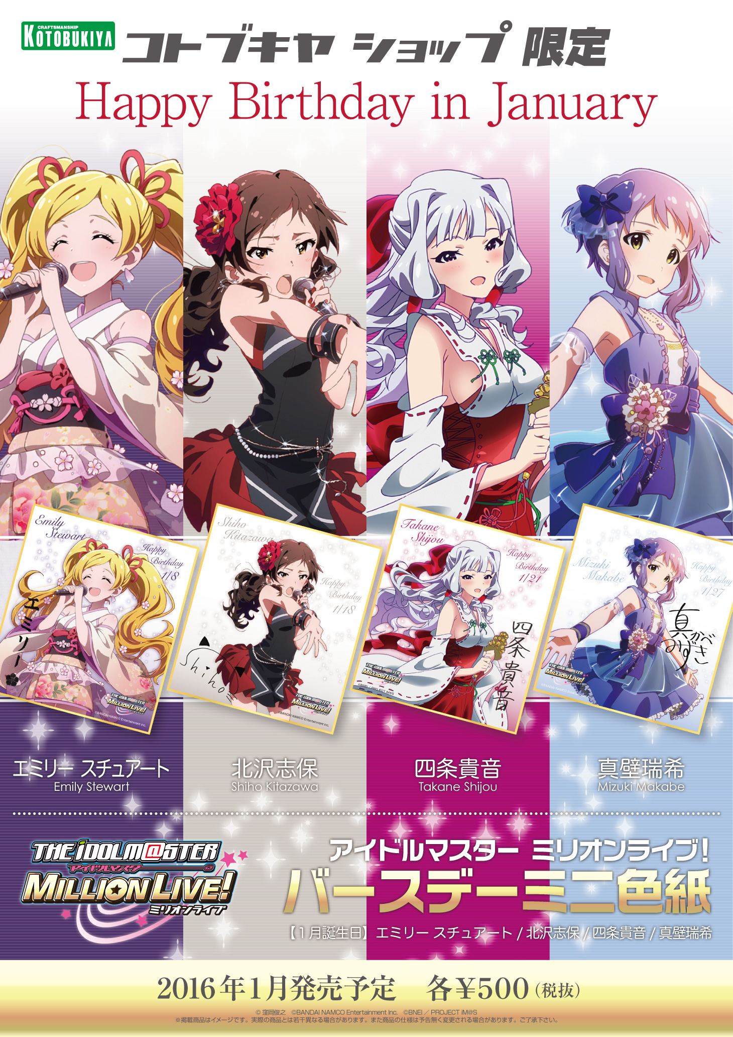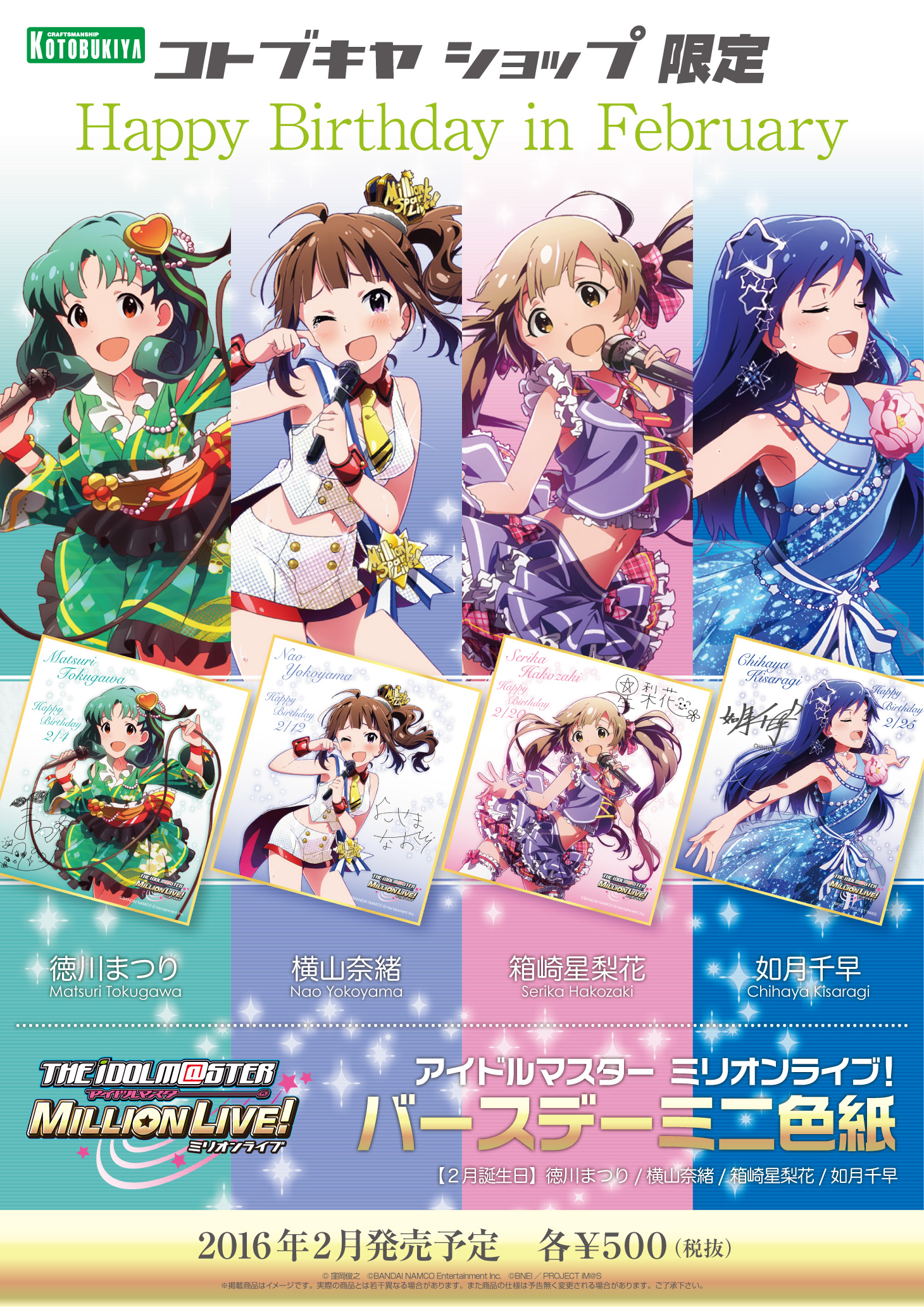 ホビーメーカー株式会社壽屋(本社:東京都立川市曙町/代表:清水一行)は、ホビーメーカー株式会社壽屋は、人気ソーシャルゲーム『アイドルマスター ミリオンライブ!』より、登場アイドル達の誕生日をお祝いする記念グッズとして、「アイドルマスター ミリオンライブ! バースデーミニ色紙」シリーズを発表、2016年1月からコトブキヤショップ限定で発売開始予定です。