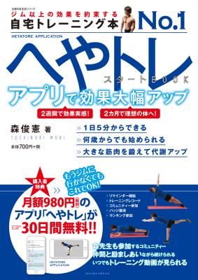 自宅でジム以上の効果を引き出す自宅トレーニングのメニューを満載。著者は、体型管理カウンセリングやパーソナルトレーニング指導、さらにオンライン上のフィットネスサービスを展開する森俊憲氏。この商品は同氏が開発した「へやトレ」のアプリが1カ月無料となる他、WEBで動画が見られる特典付です。トレーニング管理やコミュニティへの参加など、アプリの機能を利用することで、筋トレが楽しく続けられて効果が大幅にアップします。基本的な筋トレ種目とプログラムの紹介はもちろん、アプリを最大活用する方法も教えます。