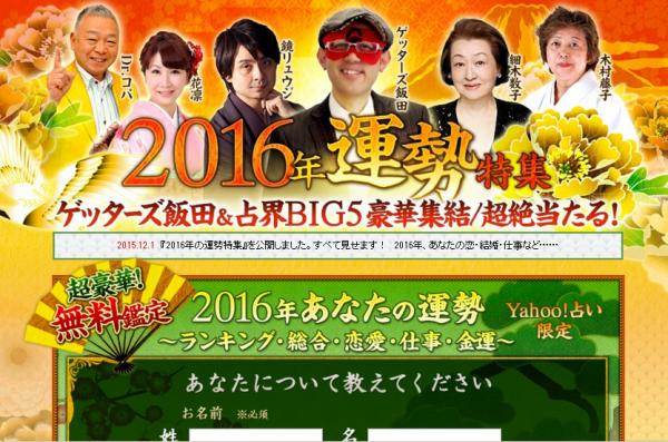 ゲッターズ飯田と占界BIG5がYahoo!占い限定で豪華集結! 2016年の運勢を占います。ゲッターズ飯田の2016年豪華開運占いでは1年間を現す強運キーワードや日運鑑定も無料で占える他、超希少な7大運勢パック鑑定も。更に細木数子など5人の有名占い師の豪華年運鑑定も超必見!
