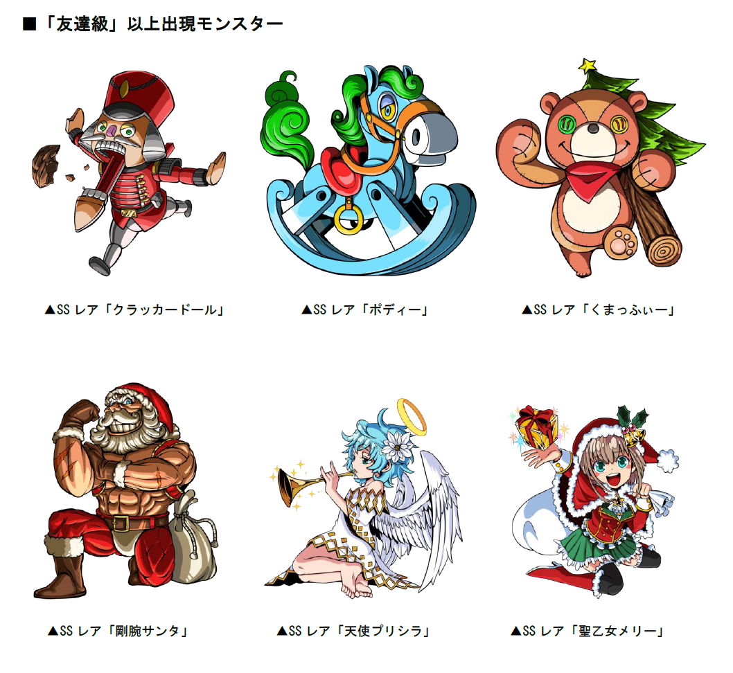 「友達級」以上のボスモンスターとして、SSレア「クラッカードール」「ポディー」「くまっふぃー」