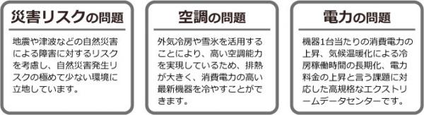 昨今、首都圏を含む日本の多くのデータセンターが直面している 『電力供給力の不足』、『空調能力の不足』、『災害リスクの問題』と言う3つの大きな課題を解決するために、青い森クラウドベースは「寒冷地型エクストリームデータセンター」を提唱し竣工いたしました。