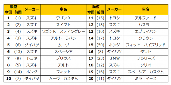 トップ10で良い動きを見せたのは「スペーシア」の7ランクUPと「フィット」の5ランクUPです。