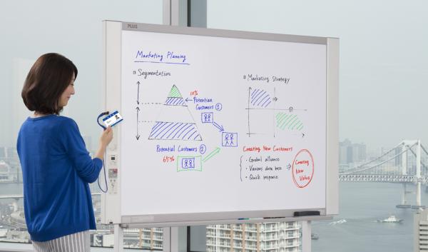 社員証(ICカード)をタッチするだけで板書データを自分のメールアドレスへ転送する最新機能の新製品「PLUSネットワークボードN-32シリーズ」など、コピーボードの国内シェアNo1.メーカー※であるプラスが最新のミーティングサポート製品を展示します。