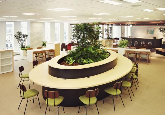 2015年7月に、旧オフィスと変わらない面積ながら、徹底した文書削減とゾーニング計画により、従業員300人全員の固定席を確保するとともに約180坪のコミュニケーションエリアを新たに創出した「赤坂オフィス」。フリーWi-Fiを備え、お取引先にも開放した開放感あふれるエントラスフロア、280席のフリー席など多彩なコミュニケーションエリアを配置して、いま注目のオフィスです。ツアー形式の見学会(予約制)、セミナー開催※、サービス(ニューミドルマンメニュー)のパネル展示※のほか、各事業紹介※も実施します。