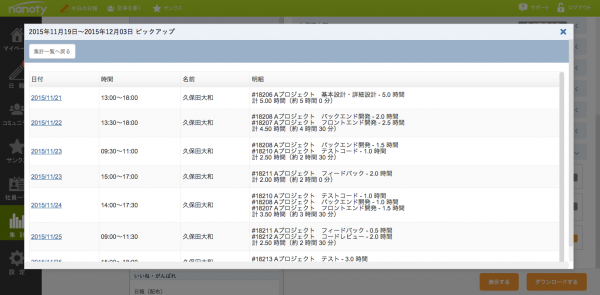 ▲nanotyでの工数集計画面(Redmineで管理している開発タスクの割当IDを確認できる)