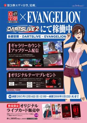 また連動企画として、エヴァ自空3rdインパクト実施のダーツライブ2設置店舗にてエヴァオリジナルダーツゲームを2015年12月14日(月)12時より限定配信。自遊空間でしかもらえないオリジナルエヴァダーツライブテーマをプレゼント。