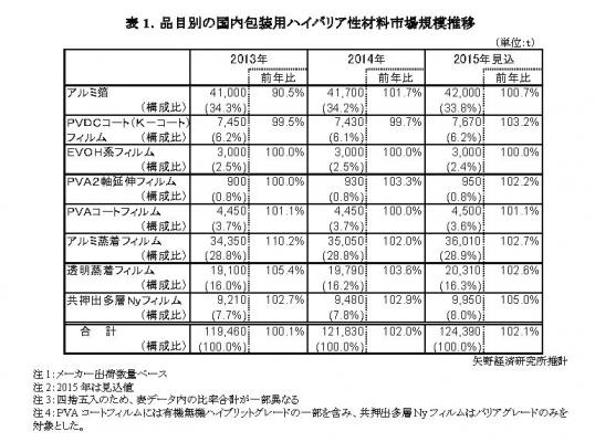 ◆2015年の包装用ハイバリア性材料市場は前年比102.1%の124,390tの見込、食