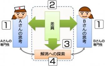 地域でのケアが重要になっている今日、医療や介護の現場では、数多くの専門職が互いを尊重しながら協働することが求められています。しかし、職種の違いや考え方の違いがコミュニケーションのギャップを生み、時として危険につながることがわかっています。表面上の対処法のみを学んでも、コミュニケーションのギャップが生じる原因を知らなければ、根本的な解決にはなりません。認知科学や知識科学の研究成果を応用して開発されたのが思考スキーム式(Thinking Scheme Method)の教育方法は、(1)自己の思考スキームの意図的な把握と表出、(2)互いの専門職の思考スキームの比較対照と理解、(3)自他の思考スキームの違いの理解・分析、(4)思考スキームの違いを踏まえた改善活動の動機づけ、の4点を促すことができます。