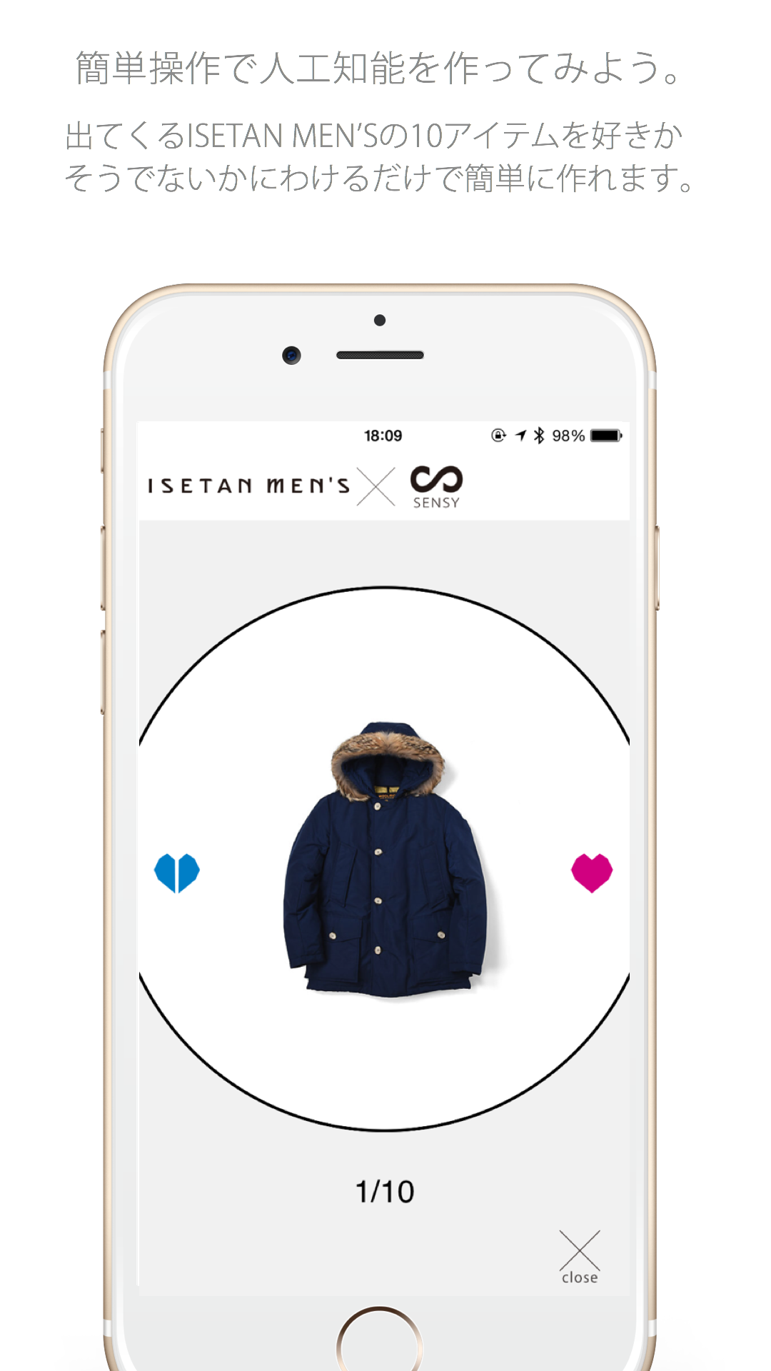 表示されるISETAN MEN’Sのアイテムを好きか、そうでないかを画面をタッチし、振り分けることによって、自分の好みを覚えさせます。