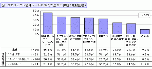 プロジェクトの失敗経験がある人に、その要因を尋ねました。その結果、最も多かったのは「関係者とのコミュニケーション不足」が挙げられ、全体で46.8%。この問題は、企業規模が大きくなればなるほど深刻となり、従業員数100名以下は32.8%に対し、1001名以上は51.1%でした。以下「リスクマネジメントへの関心度の低さ」(37.3%)、「成功の定義が不明確」(35.4%)、「プロジェクトマネジャーの経験不足」(34.6%)と続きました。