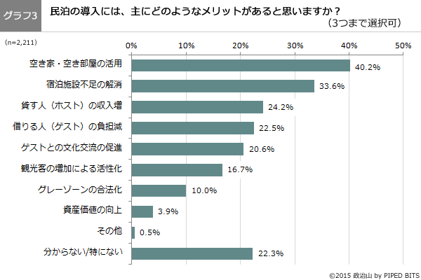 株式会社パイプドビッツ(東京都港区、代表取締役社長CEO 林哲也、東証1部パイプドHDグループ<証券コード3919>、以下「パイプドビッツ」)が運営する、政治・選挙情報サイト「政治山(せいじやま)」は、2015年12月4日から12月7日にかけて、全国の20歳以上の男女を対象に、民泊に関する意識調査を実施し2,211名から回答を得ました。本日12月17日に「政治山」で調査結果のサマリー版を公開しましたので、お知らせいたします。