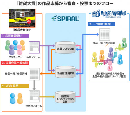 雑貨大賞は、日本を代表するクリエイターを目指す人のためのアワードです。前回(第1回)の応募作品は約800点にのぼり、受賞作品がメディアで大きな話題になったことや、副賞のヴィレッジヴァンガードによる商品化サポート等の魅力から、前回を超える応募が見込まれていました。そこでヴィレッジヴァンガードは、紙で回覧していた一次審査の手間削減や、SNS拡散を視野に入れた応募作品の一般公開及びWeb投票を実現するにあたり、「スパイラル(R)」を採用しました。クリエイターの作品応募フロー、ヴィレッジヴァンガード社内の一次審査フロー、一般のWeb投票フローをPaaSプラットフォーム上に構築することで、個人情報管理のセキュリティ担保と円滑な運営の両立を、低コストで実現しました。