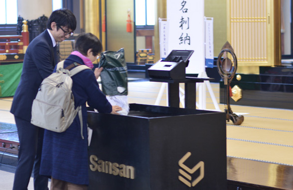 当日は100名を超える一般参加者や『Sansan』『Eight』のサービスのユーザ様がお集まりいただき、処分したい名刺をご縁への感謝をこめてご縁箱(名刺スキャナ付きの名刺箱)に入れました。築地本願寺のご本尊・阿弥陀如来の前で雅楽を交えた厳粛かつ荘厳な法要を行い、同寺の安永宗務長より法話をいただきました。