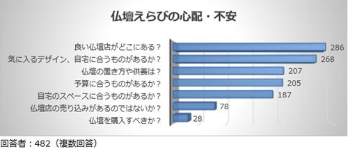 仏壇えらびを始めた頃の心配や不安を伺ったところ、1位:「良い仏壇店がどこにあるのか、わからなかった」、2位:「気に入るデザイン、自宅に合うものがあるかどうか、不安だった」、3位「仏壇の置き方や供養について、わからなかった」と続きました。購入する仏壇の種類を迷う気持ちと同じように、購入先についての不安が大きいことが窺えます。