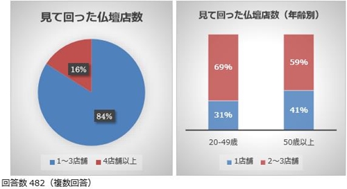 仏壇えらびに見て回る仏壇店数は、84%の方が3店舗以内と回答しています。このうち1店舗のみで仏壇を購入している割合は、世代によって差が見られました。50歳以上が41%に対し、50歳未満の世代では31%と、10%の乖離があります。ライフスタイルやこだわりに合わせて、お店を見て回っていることが窺えます。
