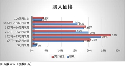 仏壇の購入単価は、初めて仏壇を購入する層が買い替え層を上回りました。買い替え層は特に25万円未満の割合が高く、コンパクトな仏壇に買い替えている傾向がわかります。