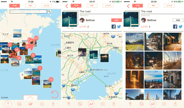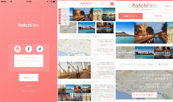 「好きをまとめて、手のひらに世界を」をテーマとする「PatchFilm」は「PatchFilm」のプラットフォーム上に位置情報付きの写真をシェアすると、写真をとった場所が自動的に地図上に表現され、場所の具体的な「位置」をまとめて管理する事が出来るサービスです。全てのユーザーの投稿を「地図」と「タイムライン」から閲覧する事ができ、気に入った他のユーザーの投稿に“LOVE”する事でその写真をお気に入りの写真としてマイページに登録する事が出来ます。