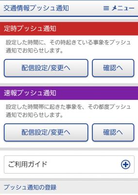 「交通情報プッシュ通知」は、あらかじめユーザーの設定した任意の時刻に、指定した路線の「渋滞」や「事故」などの情報を通知する「定時プッシュ通知」と、指定した路線の情報を速報ですぐにお届けする「速報プッシュ通知」が使用可能になりました。利用する路線が決まっているドライバーはもちろん、旅行先の交通情報を簡単に確認する事が可能です。また本サービスならではの機能として「渋滞」・「事故」・「規制」・「通行止め」が解消した際にも、情報をお届けいたします。