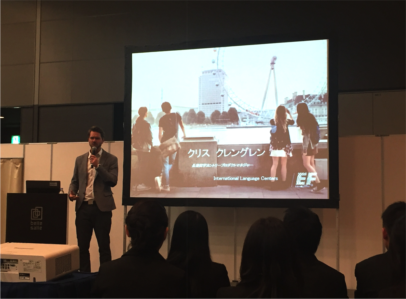 今回、基調講演のスピーカーを務めた、EFの長期留学カウントリー・プロダクトマネージャー、クリス・クレングレンは次のようにコメントします。「今回、マイナビ国際派就職EXPOにスピーカーとして参加できたことを嬉しく思います。海外では、日本と違い就職活動という文化がありません。そのため、海外でインターンシップをするということは、日本国内でインターンシップに挑戦する以上に自分のビジョンを明確に持ち、その企業の一員としてどのように役にたつことができるのかを準備しておく必要があります。また、その前提として誰とでも円滑にコミュニケーションするための語学力が必要になります。今からでも遅くはありません。もし語学力に少しでも不安を感じるのであれば、今日から語学力を磨きましょう。」