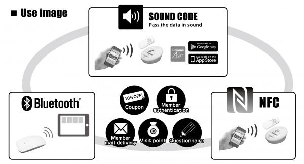 SiteStamperシリーズは、おサイフケータイへはRF通信応答による指令とデータ出力を行い、スマートフォンへは高い周波数帯の音を利用し、音圧出力でスマートフォンの専用アプリに情報を伝達します。
