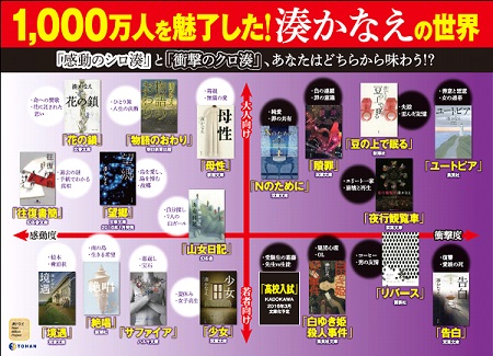 「湊かなえ Next Million Project」は、ベストセラー作家・湊さんの「告白」(双葉文庫)に続くミリオンセラーを創出することを目指しつつ、著作全体の売り伸ばしを図ることを目的としています。映画やテレビドラマなどメディア化作品も多いことから、店頭で「湊かなえコーナー」を長期間常設することにより、潜在需要を掘り起こし既刊作品の売り伸ばしを図ります。