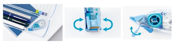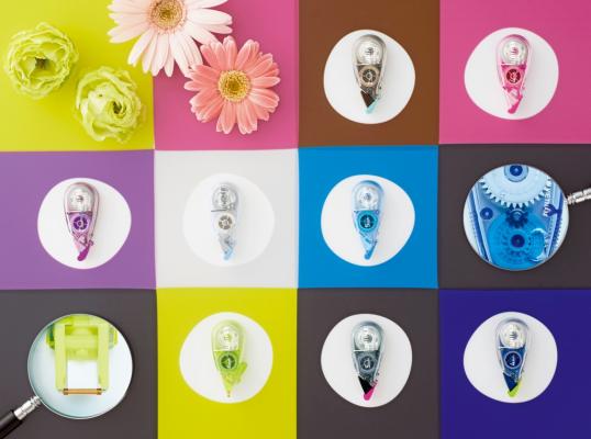 今回のリニューアルでは、より多くのお客様に満足していただける仕様を目指し、“小さくてもしっかり使える”コンセプトはそのままに、使用感の更なる向上を図りました。テープ浮きを防ぎキレイに再筆記できる新設計の“ピタッとヘッド”や、最後まで滑らかな引き心地を実現する“スムーズトルク機構”、指1本で簡単にキャップの開閉ができる“ワンタッチキャップ”を新たに搭載。さらに、手帳などの細かい修正に便利な2.5mm幅を追加し、用途に合わせて選べるシリーズ展開となっています。