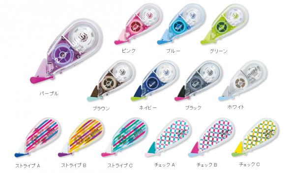 テープ幅は2.5mm、4mm、5mm、6mmの4種類。本体のカラーデザインも刷新し、クリアカラーが8色、 ストライプ・チェックの印刷が施されたパターン版が各3柄の計14種類にボリュームアップ。テープ長は6mの使い切り、メーカー希望小売価格(税抜)は従来品と同じ200円です。