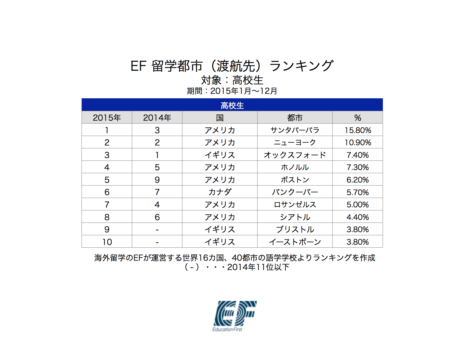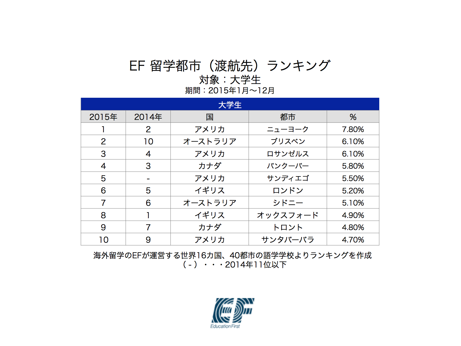 留学・語学教育事業を展開する世界最大級の私立教育機関、イー・エフ・エデュケーション・ファーストの日本法人であるイー・エフ・エデュケーション・ファースト・ジャパン株式会社(本社:東京都渋谷区渋谷2-15-1 以下、EF)は、2015年1月~12月に、EFを通じて海外留学を経験した大学生および高校生の渡航先をまとめた“EF 留学都市(渡航先)ランキング”を発表しました。