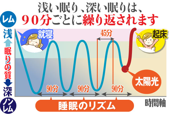 「ノンレム睡眠」と「レム睡眠」、2種の眠りの合計時間は、平均で約90分といわれています。