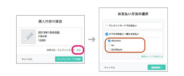 キャリア決済をご利用いただくには、購入時に表示される確認画面にて、決済方法の変更を選択してください。