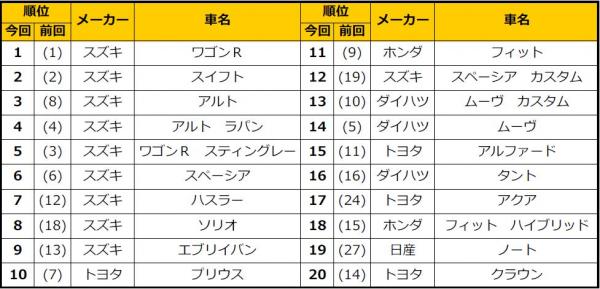 2015年も年間王者の称号は「ワゴンR」が勝ち取りました。一度も首位を渡すことのない完全勝利です。12月は比較的変化のある月でした。上位では「アルト」が8位から3位に躍進し8月ぶりにトップ3返り咲きです。「ハスラー」「ソリオ」「エブリィバン」のスズキ3車種もそれぞれ順位を上げ見事トップ10入りを果たしています。そして今回初登場は17位にランクインの「アクア」、そして「ノート」はなんと2013年以来久しぶりのランクイン。