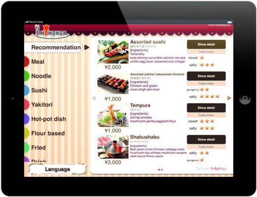 その一環として、本日より、WIPジャパンが提供しているクラウド翻訳サービス「訳す YAQS(ヤクス)」(以下「訳す YAQS」詳細参考資料参照)を、エクスウェアが飲食店向けに提供しているメニューなどの多言語翻訳・表示用iPadアプリ「SmartMenu」(詳細参考資料参照)に追加搭載します。