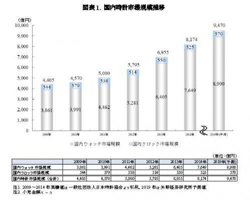 本調査における国内時計市場とは、「ウォッチ(腕時計)」、「クロック(置時計・掛時計・目覚まし時計)」の2分野を指し、2009年~2014年の実績値は一般社団法人日本時計協会の資料から引用している。