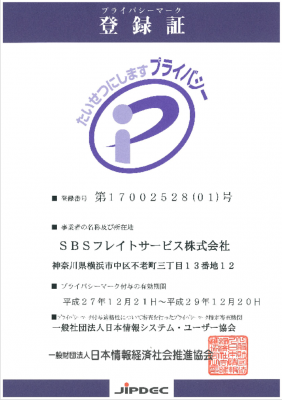 SBSグループにおいて広域物流を手がけるSBSフレイトサービス株式会社(社長:鳥海昭夫、本社:東京都江東区)は、2015年12月21日、一般財団法人日本情報経済社会推進協会より個人情報の適切な保護措置を講ずる体制等を整備している事業者としてプライバシーマーク付与の認定を受けましたのでお知らせいたします。