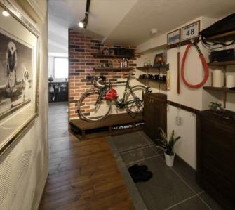 玄関には自転車が置けるガレージスペースを設け、ブリックタイルを多用して武骨なテイストに。秘密基地のような空間を演出し、意匠性と使いやすさを実現しました。