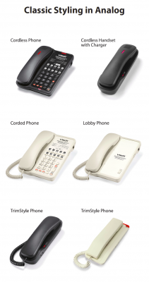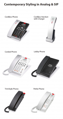 電話機は客室のインテリアと美しく調和し、客室の一部として機能するかのようにデザインされ、また、国内市場では稀なメッセージランプ付きコードレスモデルなど、をラインナップにそろえております。