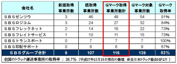 SBSグループは、(社)全日本トラック協会が昨年12月に実施した貨物自動車運送事業安全性評価事業(以下、Gマーク制度)2015年度安全性優良事業所※の評価にて、新たに9事業所が認定を受けました。これによりGマーク認定事業所数は116、取得率は、2014年度の80%から83%になりましたことをお知らせします。
