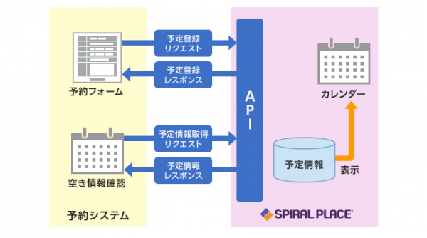 予約システムと「スパイラル プレース(R)」の予定をAPI連携すれば、予約フォームから登録があった際にAPIを使って「スパイラル プレース(R)」の予定を作成し、グループウェア上のカレンダーから予約状況をリアルタイムに確認できるようになり、お客様の利便性向上が期待できます。APIでスタッフの予定を取得し、予約システムで空き状況を表示することも可能です。「スパイラル(R)」で会員管理システムや予約登録フォーム、キャンセル受付フォームを設置し、お客様とのコミュニケーションやスケジュールは「スパイラル プレース(R)」で管理することで、業務のシステム化による効率化と顧客利便性向上の両立を図ることが可能です。