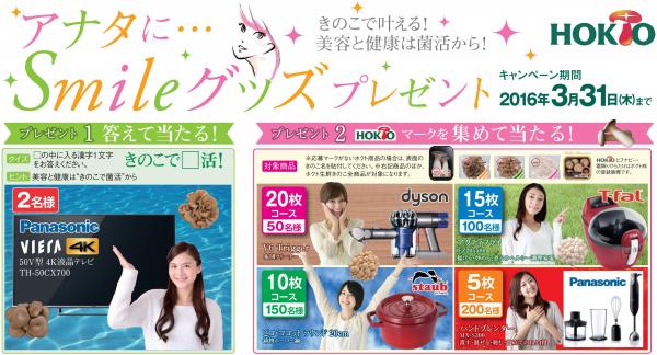 きのこ総合企業のHOKTO(ホクト株式会社/所在地:長野県長野市、代表取締役社長 水野雅義)では、ご愛顧頂いている皆さまに感謝の気持ちを込めて、Smileになっていただける賞品が当たる“アナタに…Smileグッズプレゼント”キャンペーンを開催。キャンペーン期間は1月から3月31日までです。