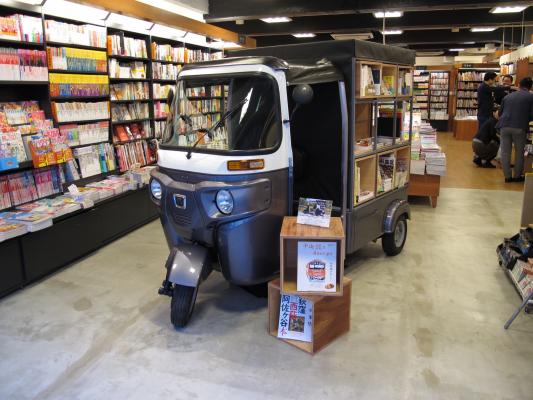 街の書店が減りつつある昨今、これからの書店はお客様を待つのではなく、こちらから会いに行くことが必要だという考えから、同店では三輪EVにボックス型の本棚を搭載し、“走る本棚”として導入しました。