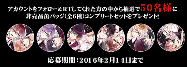 DIABOLIK LOVERS公式通販Twitterアカウントをフォローして、対象のツイートをリツイートした方の中から抽選で50名様に「非売品缶バッジ(全6種)コンプリートセット」をプレゼント!