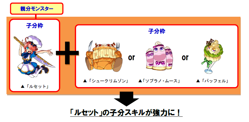 同じモンスターの子分として同時に装備させると、「ルセット」の子分スキルが強力になります。