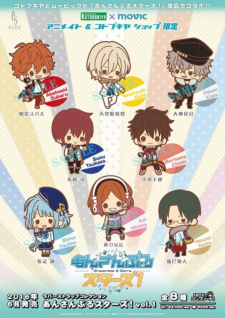 ホビーメーカー株式会社壽屋(本社:東京都立川市曙町/代表:清水一行)と株式会社ムービック(東京都板橋区)は、コラボレーション企画として、大人気アイドル育成プロデュースゲーム『あんさんぶるスターズ!』のラバーストラップコレクション第1弾・第2弾を発表、2016年6月から2ヶ月連続で発売予定です。