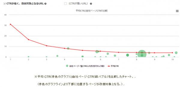「サチコミエルカ」ではGoogle Search Consoleの「検索アナリティクス」データを蓄積。Googleの検索結果に表示される自社ページのうち、世の中のWebサイトと比較してクリック率(CTR※)が低いページを抽出し、流入機会損失を起こしている改善対象ページを洗い出します。