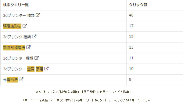 また同時に、改善対象ページに対して形態素解析(※)技術を用いて解析することで、検索クエリ(≒ユーザーの検索意図)と、改善対象ページのマッチング度を評価。どのようなキーワードがページタイトルに足りないのかを提案してくれます。