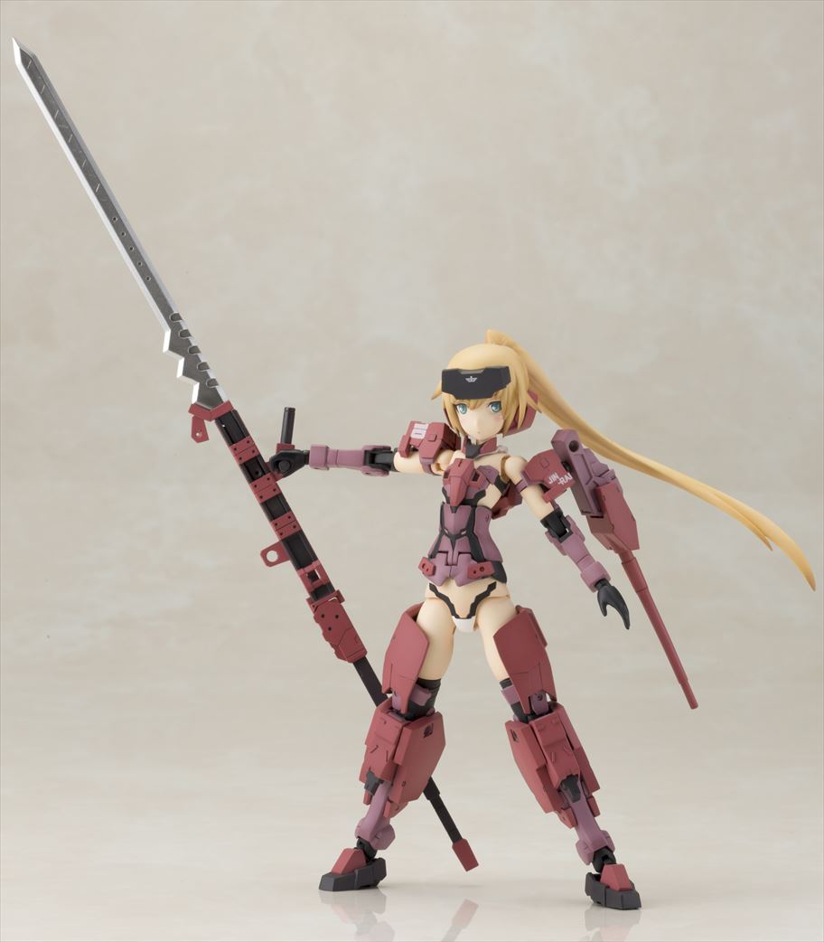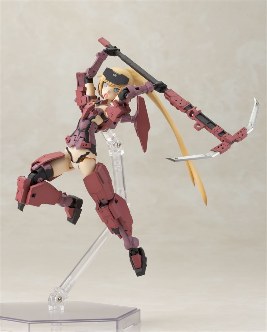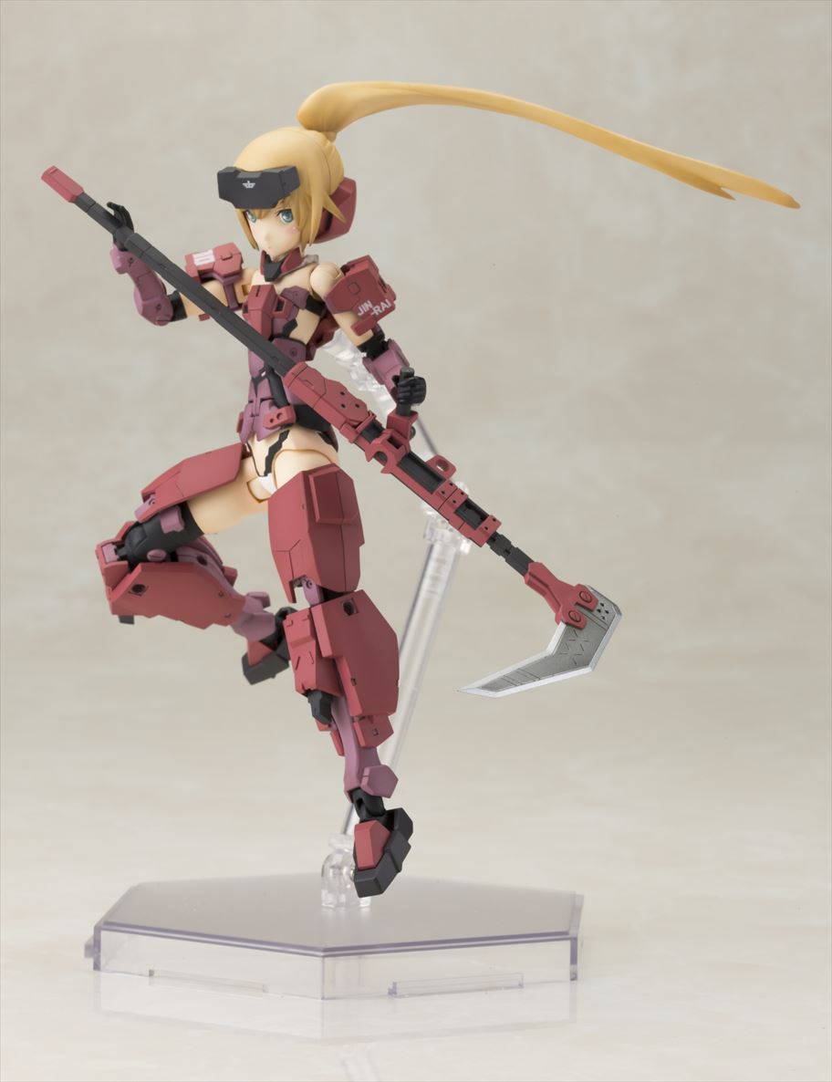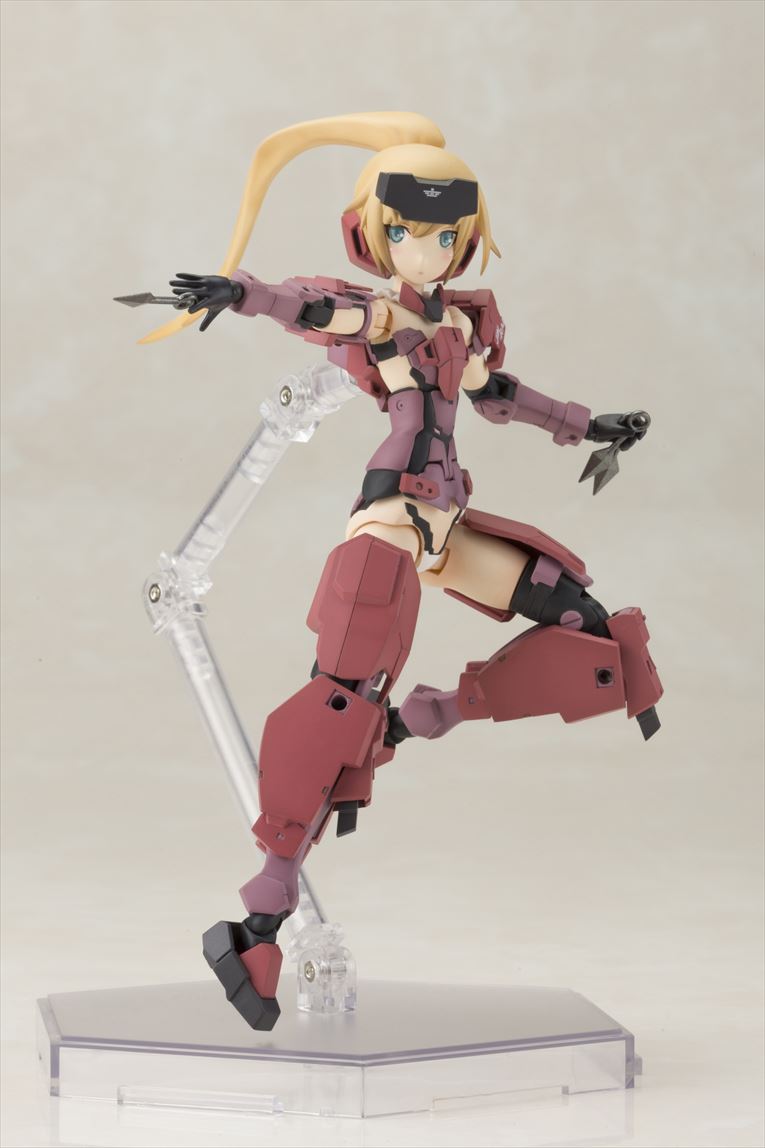 迅雷は、島田フミカネ氏が自らフレームアームズ「轟雷」を改造した機体を美少女化したキャラクターになります。4種類の塗装済み顔パーツ(右向き眼、左向き眼、正面向き眼、叫び顔)が付属、多数の武器が専用成型色で付属。複数の組み換えも可能です。腰関節のスイング可動、股関節のスライド可動を併用させる事で、広範囲な可動を実現。PVC製の手首が左右それぞれ5種付属、手首は軸可動の球体関節を採用する事で表情豊かなポージングが可能です。