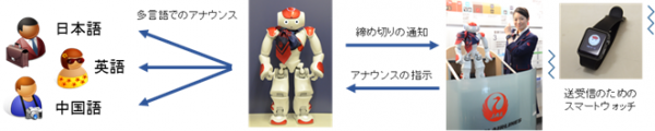 また、保安検査場前での締め切り時刻をアナウンスする業務において、空港スタッフが装着しているスマートウォッチからサービスロボットへ指示を送信し、サービスロボットからの通知を空港スタッフが受信するといった、空港スタッフとサービスロボットが連携することで得られる効果を検証します。さらに、多言語(英語・中国語)による、訪日外国人のお客さまへのロボット活用の可能性も検証します。